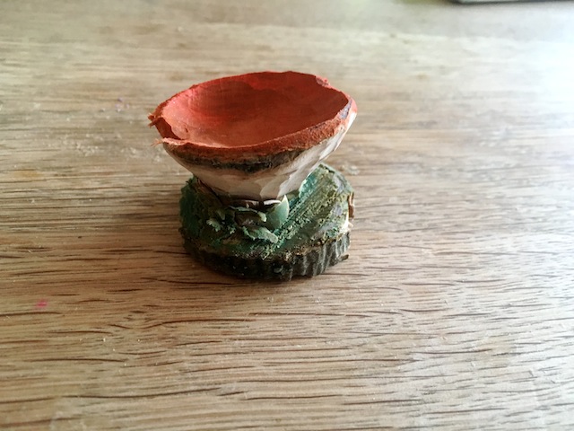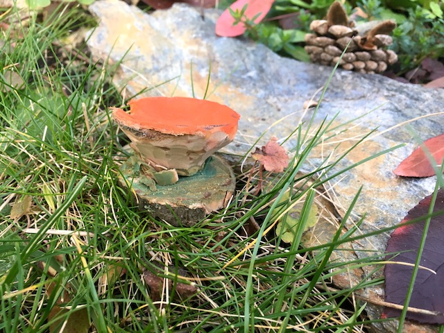 Bevor Ihr zum Malkasten greift schmirgelt Ihr den Pilz gründlich ab. Mit dem groben Schleifpapier arbeitet Ihr die tiefen Schartern heraus. Lasst das “Gras” am Fuß vom Pilz stehen. Seht Euch das Original an und malt nun den Hut vom Schwammerl in einem kräftigen Orange an.