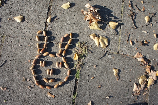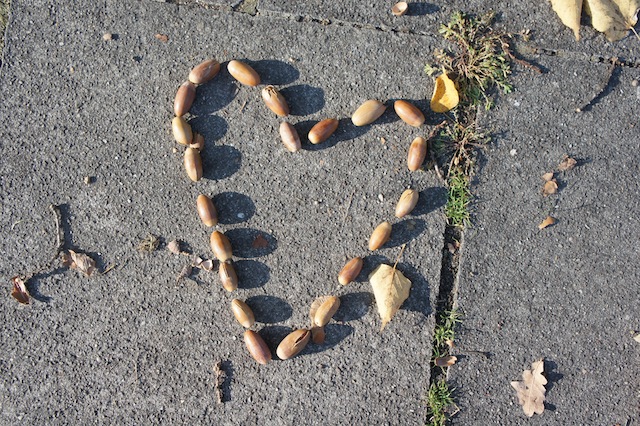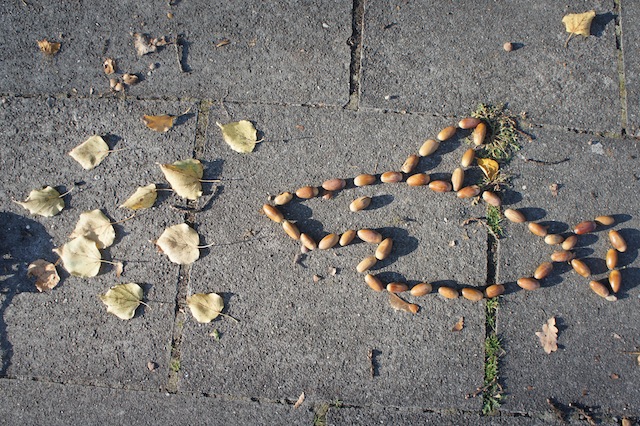 Als nächste braucht Ihr noch eine kleine freie Fläche und schon könnt Ihr und die Kinder loslegen. Nehmt die Baumfrüchte und legt damit Bilder. Egal was Ihr wollt! Ihr könnt Euch darauf beschränken nur die Konturen zu legen oder die Figuren mit den Früchten der Bäume auszufüllen. Wir Ihr wollt. Bei einigen unserer Fotos seht Ihr, dass wir auch Laub mit eingesetzt haben. Bei unserem Hai sind die goldenen Blätter ein Schwarm kleiner Fische, die vor ihm flüchten. Wenn die Kinder bei der Wanderung oder dem sonntäglichen Spaziergang etwas quengelig sind, lasst sie erst einmal die Baumfrüchte sammeln. Anschließend zeigt Ihr ihnen anhand von einer einfachen Form, wie ein Herz, wie leicht Landart mit Kindern ist. Daraus lässt sich auch ein Spiel ableiten: Das Kind oder ein Erwachsener überlegt sich einen Begriff und legt ihn mit den Baumfrüchten. Wer ihn als ersten errät, der kommt als nächster mit dem Legen dran. Ein Spiel, dass auch kleinere Kinder problemlos mitspielen können. Bei Landart mit Kindern lassen sich Kunst, Natur und Phantasie miteinander verbinden.