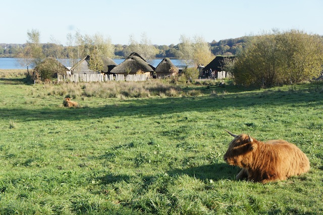 Etwa zehn Minuten Fußweg vom Museum entfernt ist das Außengelände. Hier stehen rekonstruierte Häuser aus der Wikingerzeit. Über einen Bohlenweg (nicht mit Dieter verwandt) kommen die Besucher zum Haus des Kammmachers. Dort bekommt Ihr zu sehen, wie die Wikinger gekocht haben. Lecker Essen ohne Thermomix. Weiter geht´s zum Haus 2. Der Unterkunft vom Tuchhändler. Ein Stall, ist dort in das Haus integriert gewesen. Auffällig ist das Fischerhaus in Blockbauweise. Für Haithabu ein eher ungewöhnlicher Baustil. Vor dem nachgebauten Dorf weiden friedlich die schottischen Hochlandrinder.Wer möchte kann um das Haldebyer Noor, so heißt dieser See an dem Haithabu liegt, wandern.