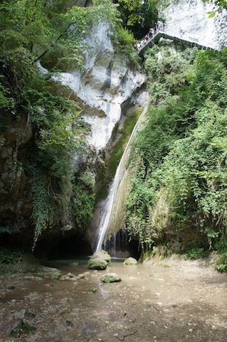 Wer die schwarze, längste Tour wandert, kommt auch an Aussichtspunkten vorbei. Ein Blick über das Tal zeigt, dass es schon für unsere frühesten Vorfahren ideal gewesen ist, hier zu leben. Ganz ohne Pizza. Sie hatten Höhlen, Wasser und Wälder die sie ernährten. In der Grotta die Fumane entdecken Archäologen einen menschlichen Schneidezahn der zwischen 39.000 und  36.500 Jahren alt sein soll. Es stellt sich hier die Frage, was spätere Ausgräber nach knapp 40.000 Jahren von unserer Zivilisation finden: Handyakkus oder Weichspülerflaschen aus Plastik? Ein besonderer Höhepunkt ist die Schaukel vor einem Wasserfall. An über 20 Meter langen Stahlseilen hängt ein massiver Sitz, der an ein Kettenkarussel erinnert. Darin dürfen Kinder und Erwachsene Platz nehmen. Sie schwingen dann bis wenige Meter vor die Kaskade. Ein unvergleichliches Erlebnis. Ebenso ist es spannend hinter einem Wasserfall zu stehen und vor einem rauscht das Wasser als Vorhang hinunter. Mit einem Rucksack voll von Abenteuern geht es zurück zum Parkplatz. Unterwegs kommt auf der rechten Seite vor dem Dorf ein kleiner Sportplatz. Davor befindet sich das Ristorante „Dai Fradei“. Wer hier eine frisch zubereitete Pizza, die auch günstig ist, gegessen hat, der langt nie wieder eine aus dem Tiefkühlregal an. Die Preise sind hier so moderat, dass die ganze Familie einkehren kann. So kommt bei den Kindern im italienischen Wortschatz nun auch Cascata dazu.
