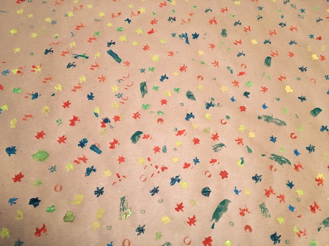 Nach unserer Stempelparty lasst Ihr das Geschenkpapier trocknen. Dieser Arbeitsschritt ist der Schwerste für die Kinder: Abwarten. Sobald das Papier trocken ist, dürft Ihr es schon verwenden. Es fällt auf, dass dieses Geschenkpapier mit viel Liebe selbst gemacht ist und hinterlässt entsprechend Eindruck.