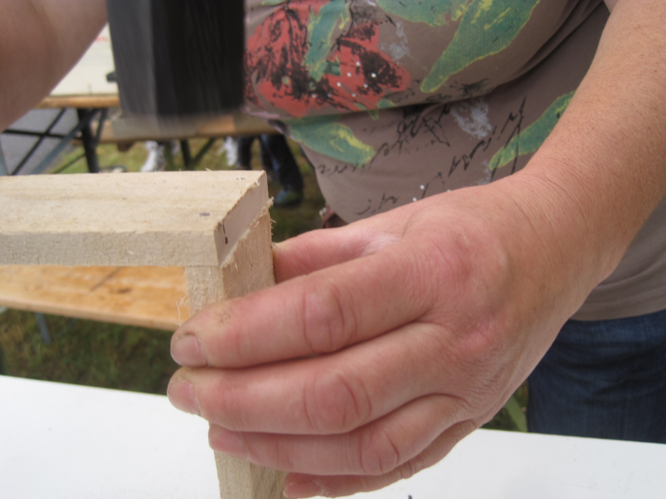Klappt die Säge vom Taschenmesser auf und sägt schrägt damit in das Holz. Daraus wollen wir jetzt das gräßliche Maul vom Drachen schnitzen.
