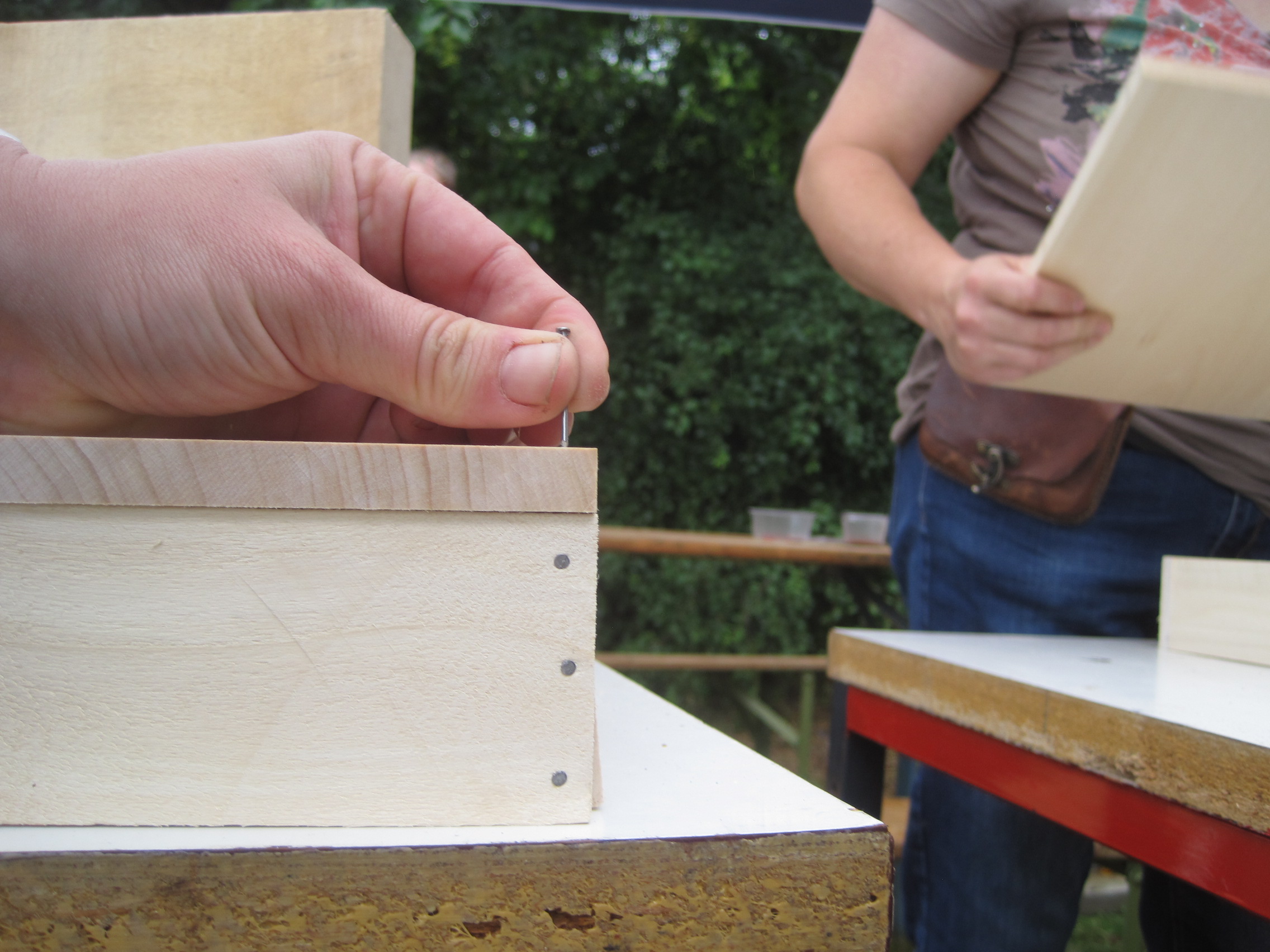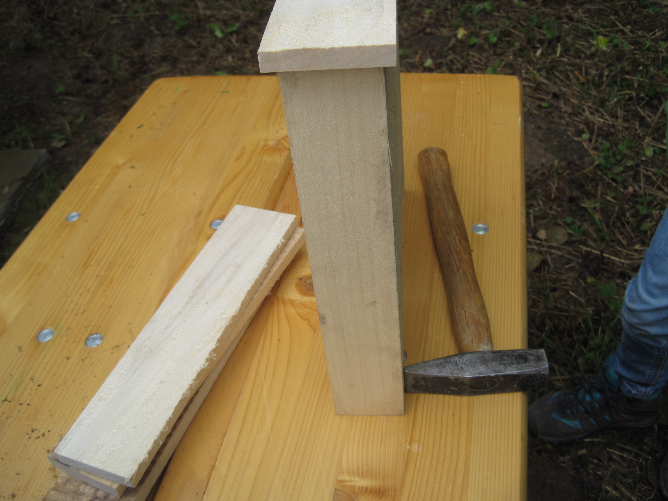 Zuerst baut Ihr aus den vier Seitenwänden eine Rahmen. Der sollte so groß sein, dass er auf die Bodenplatte passt. Nagelt dazu die vier Latten zusammen. Klar, dass die Kinder dabei mithelfen.