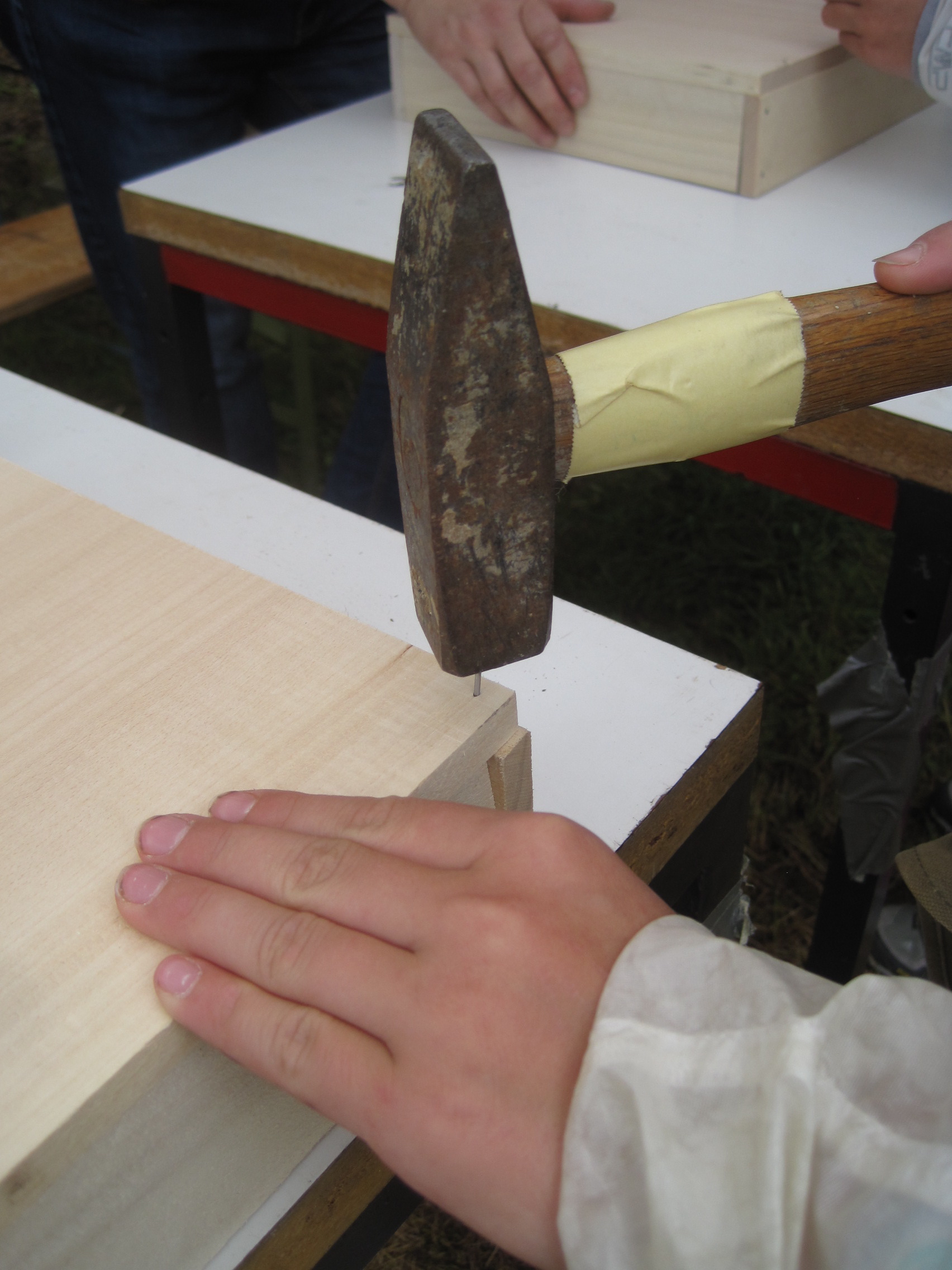 Die Kinder schnitzen nun die Zähne vom Drachen. Verwendet dazu Restholz von unserer Schnitzarbeit und spitzt auch diese an einem Ende an. Mit der Ahle bohrt Ihr links und rechts in den Oberkiefer jeweils ein Loch. Dort steckt Ihr die Zähne hinein.