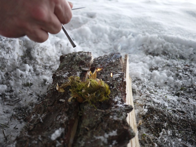 Legt ein wenig Zunder, Reisig und dünnere Ästchen bereit. Baut Euch zuerst ein Zundernest. Reibt ein wenig Magnesium vom Magnesiumstab dort hinein. Nun fahrt Ihr mit einem Stück Metall langsam, aber mit Druck runter. Es sollten Funken entstehen. Diese bringen das abgeschabte Magnesiumpulver zum Brennen und dieses entzündet den Zunder. Baut langsam das Feuer auf. Um ein Lagerfeuer zum Brennen zu bringen, braucht es ein wenig Geduld. Wer zu schnell große, dicke Äste verwendet, der erstickt das Feuer.