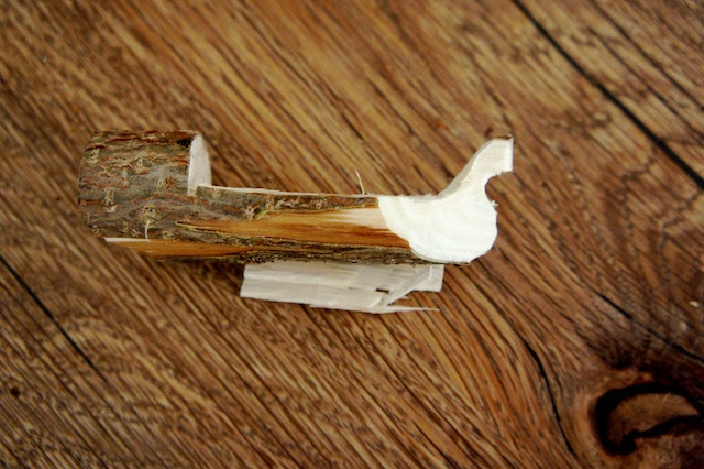 Als nächstes spitzt ihr den dicken Haselnusszweig an einem Ende wie einen Bleistift an und flacht die Spitze ein wenig ab.