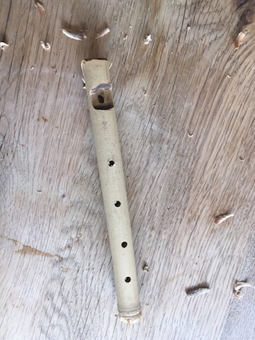 Wie wichtig die Ahle vom Taschenmesser ist, dass lernt Ihr jetzt kennen. Die Kinder schnitzen damit die Löcher unserer Flöte in den Bambus. Wie gesagt, dieses Holz hat es in sich und das lernt Ihr jetzt so richtig kennen. Bambus biegt sich unglaublich gut, ist aber trotzdem hart. Achtet darauf, dass die Löcher der Flöte auf einer Linie liegen.