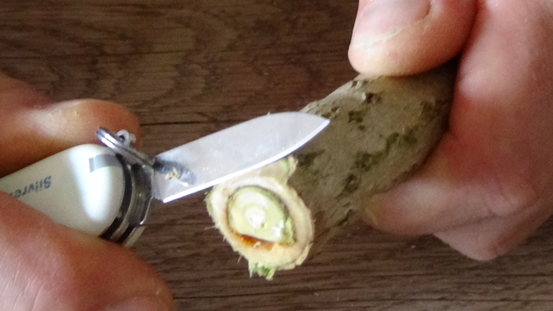 Hollunder ist sehr weich und bricht leicht. Dreht deshalb beim Schneiden mit dem Taschenmesser immer wieder das Holz.