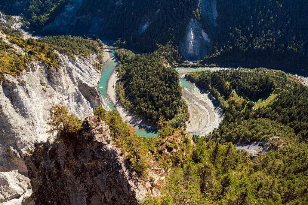 Aber da ist noch mehr. Schmale Pfade wechseln sich ab mit grandiosen Ausblicken und bilden eine Bühne für ausgedehnte Outdoor-Abenteuer. Perfekt für alle, die den Sommer aktiv erleben wollen – egal ob zu Fuß oder auf dem Bike. Tourentipp: Rheinschlucht Wanderung Ruinaulta Sut 656.1. Die anspruchsvolle Tour beginnt im kleinen Bergdorf Trin Digg und führt über Ransun hinab in die Schlucht. Highlights: spektakuläre Aussichtsplattformen und die beeindruckende Hängebrücke über den Rhein.