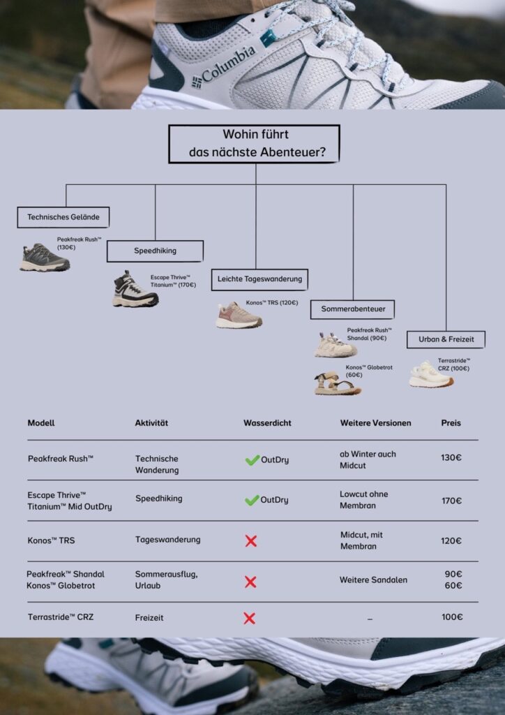 Doch was für ein Columbia Omni-Max Schuh ist der Richtige? Dazu hat Columbia eine Übersicht erstellt an der sich die Outdoorer orientieren können um in wenigen Sekunden den idealen Schuh zu finden.