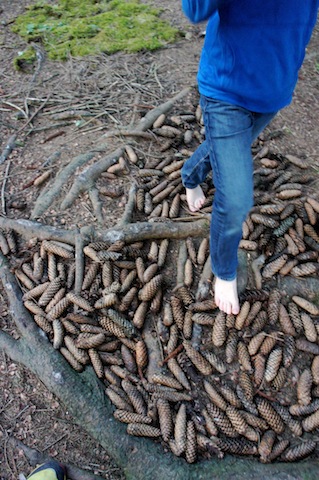 Ein selbstgebauter Barfußpfad im Wald ist schnell umgesetzt: Mit Naturmaterialien wie Moos, Tannenzapfen, Rinde, Lehm, Sand und Wasser lassen sich abwechslungsreiche Stationen gestalten. Die Kinder laufen langsam darüber und benennen, was sie spüren. So entwickeln sie ein Gespür für Texturen, Temperaturen und den eigenen Körper. Ein solcher Pfad fördert die Wahrnehmung und macht großen Spaß – auch bei kleineren Kindern.
