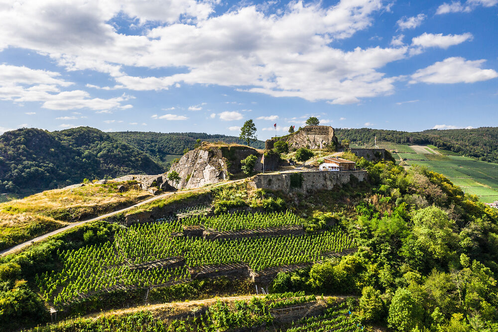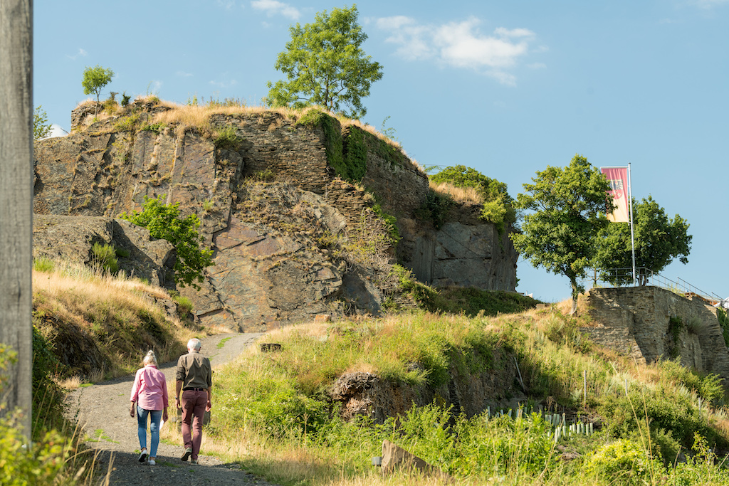 Unterhalb der Burg lädt eine bewirtschaftete Schutzhütte (bis Ende Oktober am Wochenende geöffnet) zu regionalem Wein und kleinen Snacks ein. Ein perfekter Ort, um Kraft zu tanken, bevor es weiter Richtung Rech und Schwedenkopf geht.