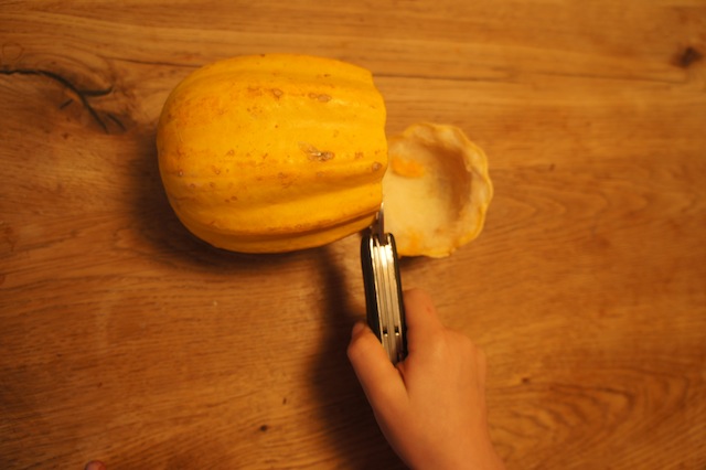 Top 10 Kürbis-Schnitzmotive für Kinder: Schneidet mit dem Taschenmesser die Augen vom Kürbisgeist aus. foto (c) kinderoutdoor.de
