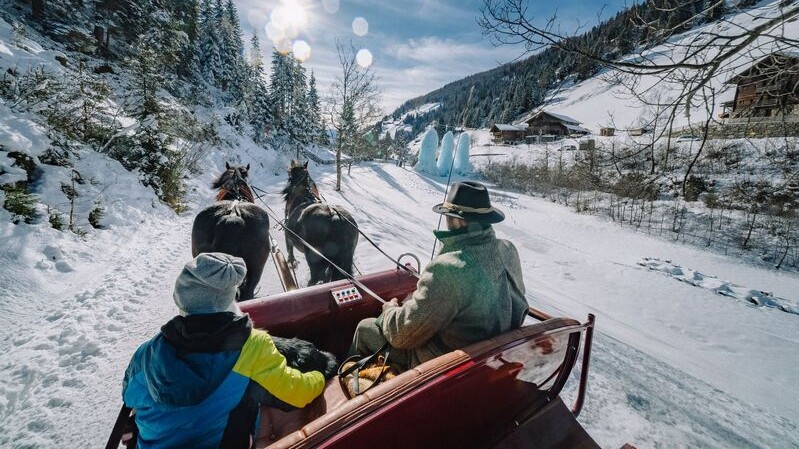 Wer es gemütlicher mag, genießt eine Kutschenfahrt mit Ingo Fürhapter. Eingehüllt in warme Decken, begleitet vom gleichmäßigen Rhythmus der Hufen, wird der Ausflug durch das verschneite Tal zum Klassiker für Paare und Familien.