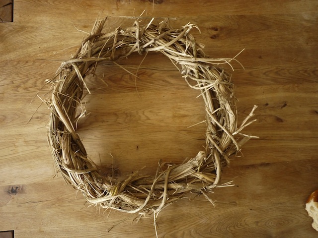 Besorgt euch einen Strohkranz im Bastelgeschäft oder Blumenladen. Legt alle Materialien bereit. Dadurch spart ihr Zeit beim Basteln.