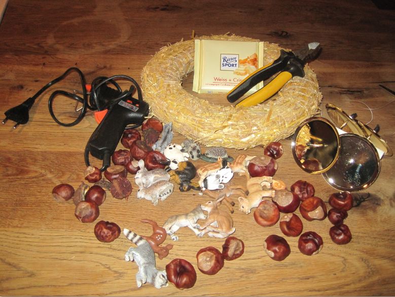 Brauche ich spezielle Materialien? Nein, Kastanien und ein Strohkranz reichen als Basis.