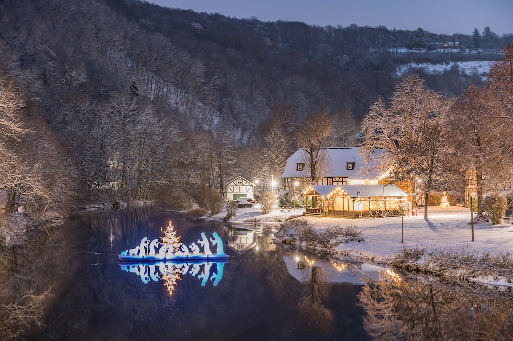 Ein weiteres Highlight ist die acht Meter breite schwimmende Krippe, die mitten in der Wied liegt. Sie wird in der Dämmerung stimmungsvoll beleuchtet und ist Teil des bekannten Weihnachtsdorfs Waldbreitbach. Bis zum 25. Januar 2026 ist der gesamte Ort festlich geschmückt. Außerdem können Besucher mehr als 80 Krippen unter freiem Himmel entdecken. Ein Abschnitt des Krippenwegs verläuft parallel zur Wied‑Runde, sodass sich beide Erlebnisse wunderbar verbinden lassen.